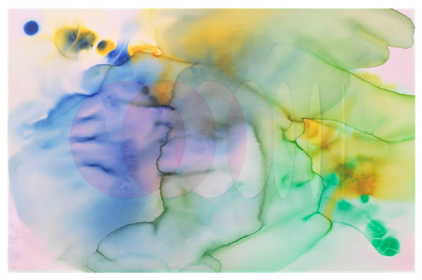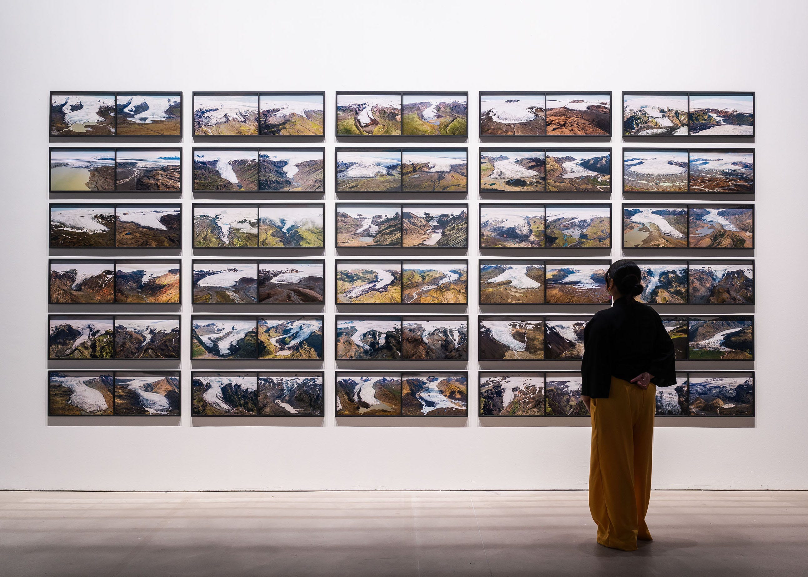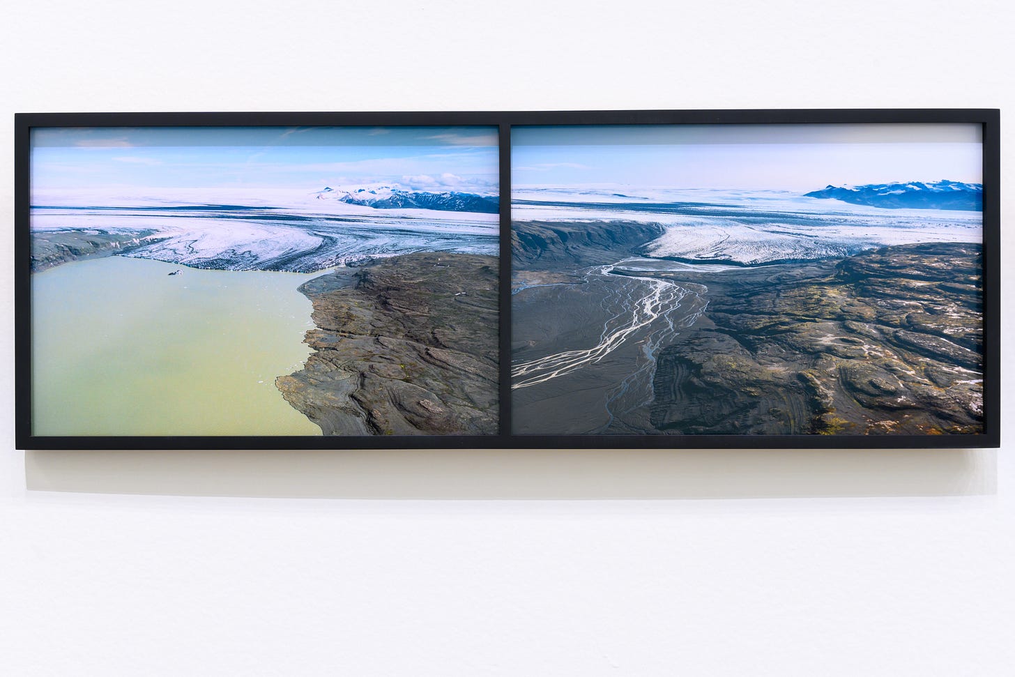 Ein wiederkehrendes Thema in Olafur Eliassions künstlerischer Praxis ist seine Auseinandersetzung mit Gletschern und Berglandschaften. So reiste er 1999 zu zahlreichen Gletschern in seiner Heimat Island und fertigte fotografische Porträts von diesen an. Im Jahr 2019 suchte er die Orte erneut auf, um sie abermals zu dokumentieren. Die tiefgreifenden Veränderungen dieser Eislandschaften werden hierbei vor allem in seiner Arbeit The glacier melt series 1999/2019 deutlich, in der er die zeitversetzten Porträts der Orte jeweils direkt gegenüberstellt. Für sein Werk Beyond human time nutzte Olafur Eliasson hingegen Stücke von uraltem Gletschereis, das von der grönländischen Küste stammt. Gemeinsam mit ausgewählten Farbpigmenten positionierte er die Eisstücke auf einem Papier und überließ sie anschließend dem natürlichen Schmelzvorgang. Im weiteren Verlauf verteilte das aus den Eisstücken resultierende Wasser die Farbpigmente organisch auf der Oberfläche des Papiers und schuf somit eine zufällige und auf natürlichen Prozessen beruhende Bildstruktur.